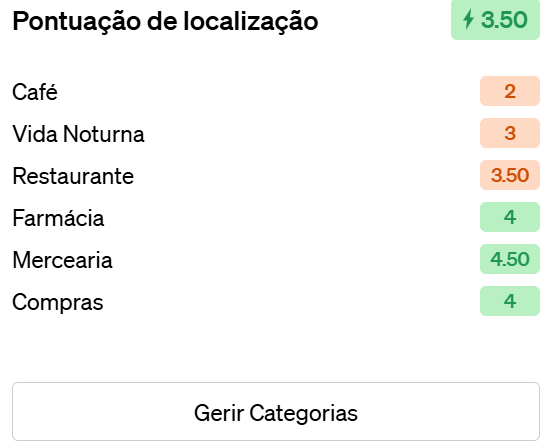 A Pontuação de Localização auxilia a avaliar rapidamente o desempenho da localização de um imóvel em vários critérios importantes de estilo de vida e acessibilidade, facilitando a avaliação do seu apelo para diferentes perfis de clientes.